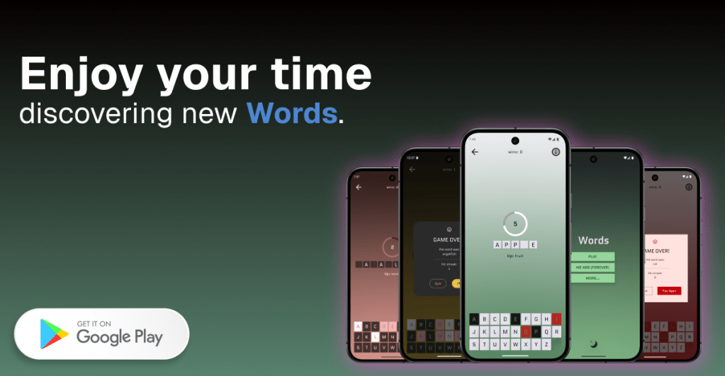 Words is a gaming application similar a lot with the classical Hangman Game, but it has a simple and modern design. Users can play it in any languages that supports the latin alphabet, because the words are dynamically generated by AI.